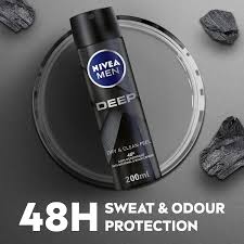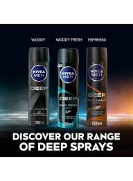 Nivea Men Deodorant Spray - Deep Black Carbon Dark Wood - Antiperspirant - 150 ml Nivea Men Deep 48H antiperspirant spray protects your skin from sweat and bacteria. The spray ensures a long-lasting dry and clean skin feeling. The effective formula with Black Carbon works powerful against bacteria and has a masculine dark wood fragrance. Skin compatibility is dermatologically proven.