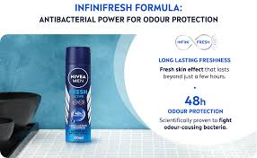 ANTIBACTERIAL ODOR PROTECTION: NIVEA MEN Antibacterial Deodorant Spray for Men fights the odor-producing bacteria in your armpits, thus helping reduce body odor. FEEL FRESH AND CONFIDENT IN EVERY MOMENT: With amazingly fresh and long-lasting fragrance, this men’s deodorant keeps you fresh and confident, wherever you go! INFINI FRESH FORMULA: NIVEA MEN’s unique Infini Fresh formula is scientifically proven to deliver 48 hours of active protection. Choose the freshness that lasts beyond just a few hours. FRESH ACTIVE SCENT: Infused with an active masculine fragrance, this deodorant spray keeps your underarms smelling fresh and gives you a clean and energizing feel, even on your active days. FOR ALL SKIN TYPES, ALUMINUM FREE: Made without aluminum, this dermatologically approved skin tolerance formula glides onto the skin easily to provide odor protection without causing irritation.