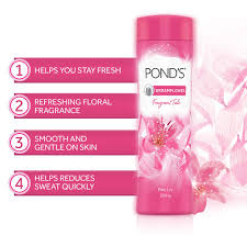 Pond's Talc is infused with the delightful fragrance of Pink Lily and enriched with Vitamin B3 for soft, smooth, and glowing skin The finest texture of talcum effectively absorbs sweat, keeping you dry and comfortable, and combats bacteria, ensuring long-lasting freshness This talcum powder offers an instant burst of freshness after every shower, keeping you rejuvenated and feeling fresh for long hours Pond's Dream Flower Talc effectively removes excess oil secretion on the face, helping to maintain a balanced and even-toned complexion Use Pond's Dream Flower Talc every day, especially before exposure to the sun, to keep your natural glow intact