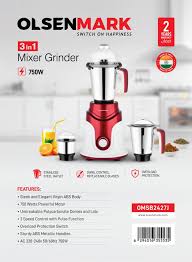 Brand Olsenmark Colour Black/Yellow/Silver Material Stainless Steel Special features Overheat Protection Capacity 0.5 Liters Voltage 240 Volts POWERFUL 550W MOTOR, HARMONIC GRINDING TECHNOLOGY – With the Olsenmark mixer you can prepare your meals easily and conveniently. Harmonious grinding technology with 550 W power for super fine grinding. All you have to do is pour the necessary ingredients into the practical jars and set the appropriate speed. Effortlessly mix spices, garlic, onions, sauce, sauces and the toughest ingredients for your simple cooking. DRY & WET GRINDING BLADES, 3 SPEED CONTROL with OVERHEAT PROTECTION – This grinder mixer comes with wet and dry grinding stainless steel blades for fine grinding and mixing; Makes it easier to prepare smoothies, shakes and purees. Keep control of your crush and mix creations with the three-speed functions with an incher function for quick crushing. This blender grinder ensures efficient mixing of ingredients with the right consistency and is equipped with overload protection for safe use. STAINLESS STEEL JARS, SAFETY TWIST LOCK- It has 3 practical stainless steel grinding jars (1.5L, 1.0L and 0.5L) with fixed sharp blades for different applications. Manufactured with a screw-top container for safe use and durability. And the container comes with unbreakable polycarbonate lids to create an airtight seal to keep your cooking area clean without any spills. VERSATILE & MULTIPURPOSE SAUCEPAN - This multi-purpose Saucepan is easy to clean with non-stick coating and induction-proof base, a perfect addition to any kitchen. It's perfect on any heating surface like ceramic, electricity, gas, etc. It can be used to make a variety of dishes like curries, sauces, stews, stir-fries, the uses are endless! Deep fry, sauté and brown your favourite ingredients without feeling guilty. Its strong non-stick coating releases food instantly. The high-quality, thick-layer non-stick coating enables cooking with less oil. STURDY ERGONOMIC HANDLES, NON-SLIP FEET - This mixer grinder ensures efficient mixing of ingredients with the right consistency and with sturdy handles, the jars sit very well in the hand. The rubber feet make the mixer more stable and ensure absolute safety for your health.