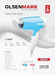 Brand Olsenmark Colour white Material Acrylonitrile Butadiene Styrene Wattage 850 KW Power source plug_in_electric A 850 W hair dryer has a foldable handle made from ABS materials, which makes it perfect for travel and ensures quick drying. It has two speed controls and one-level heat temperature for fast and perfect results. The dryer is also equipped with overheat protection to prevent damage. The total length of the cable is 1.5 m, which makes it convenient to use. Compact and lightweight design, this dryer is perfect for travel, in-house and salon styling.
