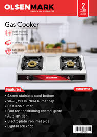 Material Stainless Steel Special features Gas Brand Olsenmark Heating elements 2 . 1YEAR WARRANTY AUTO IGNITION - Olsenmark double burner gas stove comes with an auto-ignition feature for easy operation, you can ignite the gas top with just hobs & cooktops, the knob is turned on at an angle where the burners are ignited through electric or battery. CAST IRON PAN BURNER - Made from premium quality cast iron burner to provide durability and doesn't rust and is made from a durable material which capable to sustain even at extremely high temperatures without any issue. Holds all the cooking utensils from pans to casserole's from large to small size perfectly. STAINLESS STEEL BASE - This Olsenmark gas stove hob has a Stainless Steel base with black burners, sure to look eye-catching in your home. Featured with easy to operate Knobs. The knob functions smoothly and is designed to be super stylish to complement the gas top. HIGH-EFFICIENCY BURNER - The stainless steel & brass burner hobs offer high-efficiency flame levels which perfectly suits all your cooking needs with high flame with adjusting options. Power: 28-30MBar, 4.5kw(3.27.2g/h). EASY CLEANING & MAINTENANCE - The gas stove is designed to last long. It assures easy cleaning and maintenance while being the utmost convenience to use.