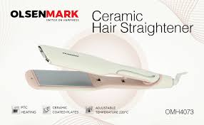 Product benefits Provides customizable styling for various hair types with a smooth, safe, and flexible ceramic hair straightener.Provides customizable styling for various hair types with a smooth, safe, and flexible ceramic hair straightener. Shape Flat Brand Olsenmark Material Ceramic Colour black wide plate 360 swivel cord floating AC: 220 - 240V-50/60Hz Ergonomic design