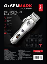 Recommended uses for product Beard Colour Silver Item weight 0.3 Kilograms Brand Olsenmark Power source Battery Powered Material Stainless Steel Special features Waterproof Blade material Stainless Steel Target audience Men Batteries required? No A professional hair and beard trimmer for men with high precision and a built-in lithium battery for best results, The set has 10 separate comb attachments of 1.5mm, 3mm, 4.5mm, 6mm, 10mm, 13mm, 18mm, 19mm, 22mm, and 25mm. features a special big blade made of stainless steel with the best cutting performance to ensure constant and precise cutting. Features an LED display and an ON/OFF switch for ease of use. The blades are removable and washable for easy cleaning. The trimmer is IPX7 waterproof and can be used with and without the cord.